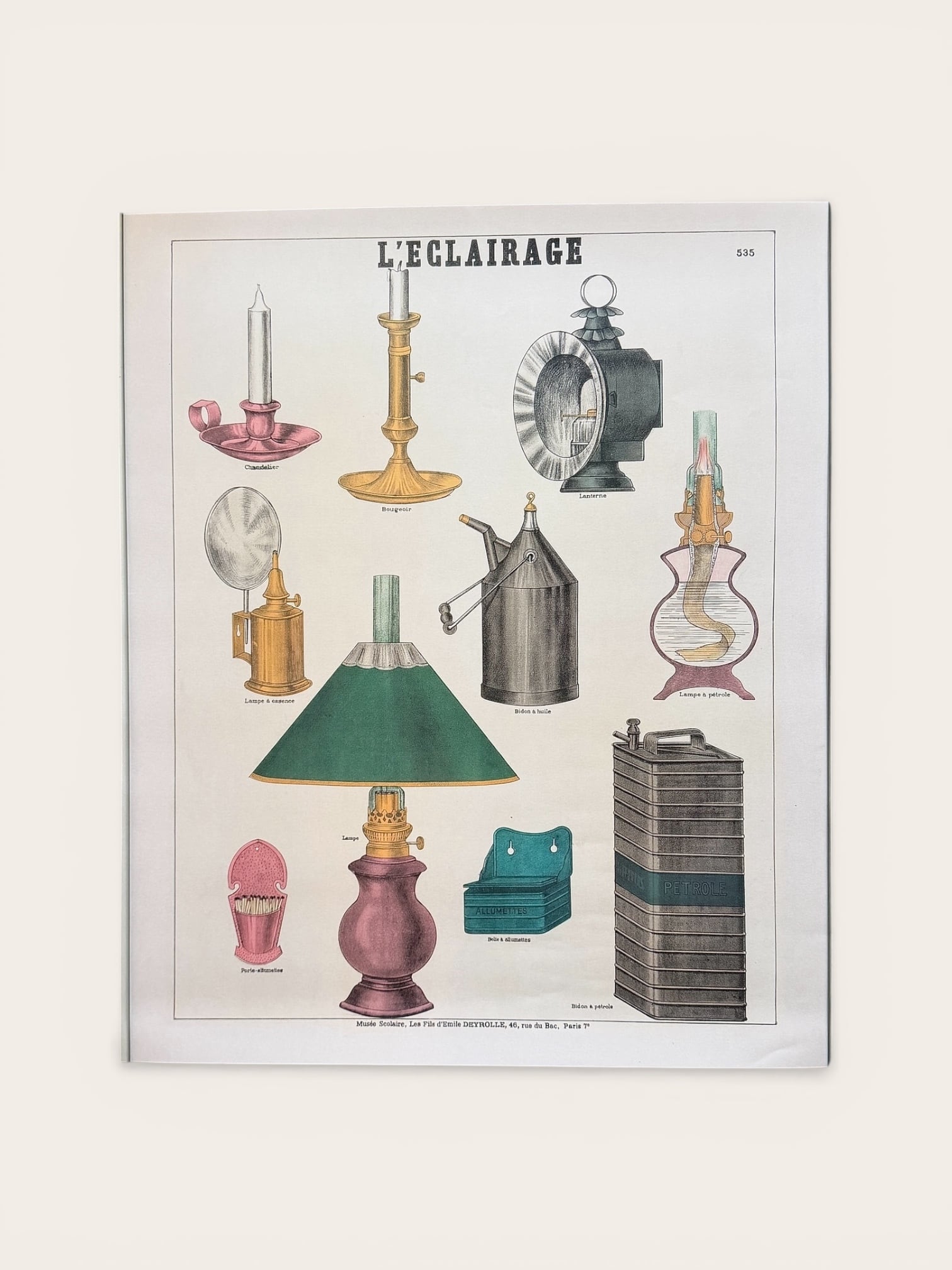 照明の進化を紹介しています。オイルランプや燭台、ランプなど、時代を通して使われてきた10種類の照明の形が描かれています。
