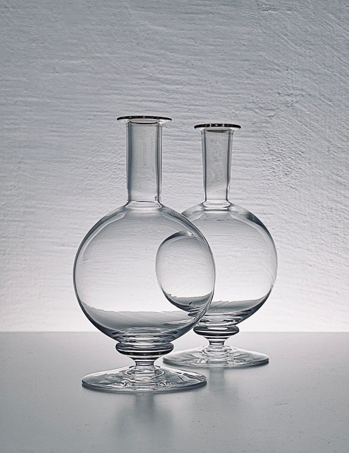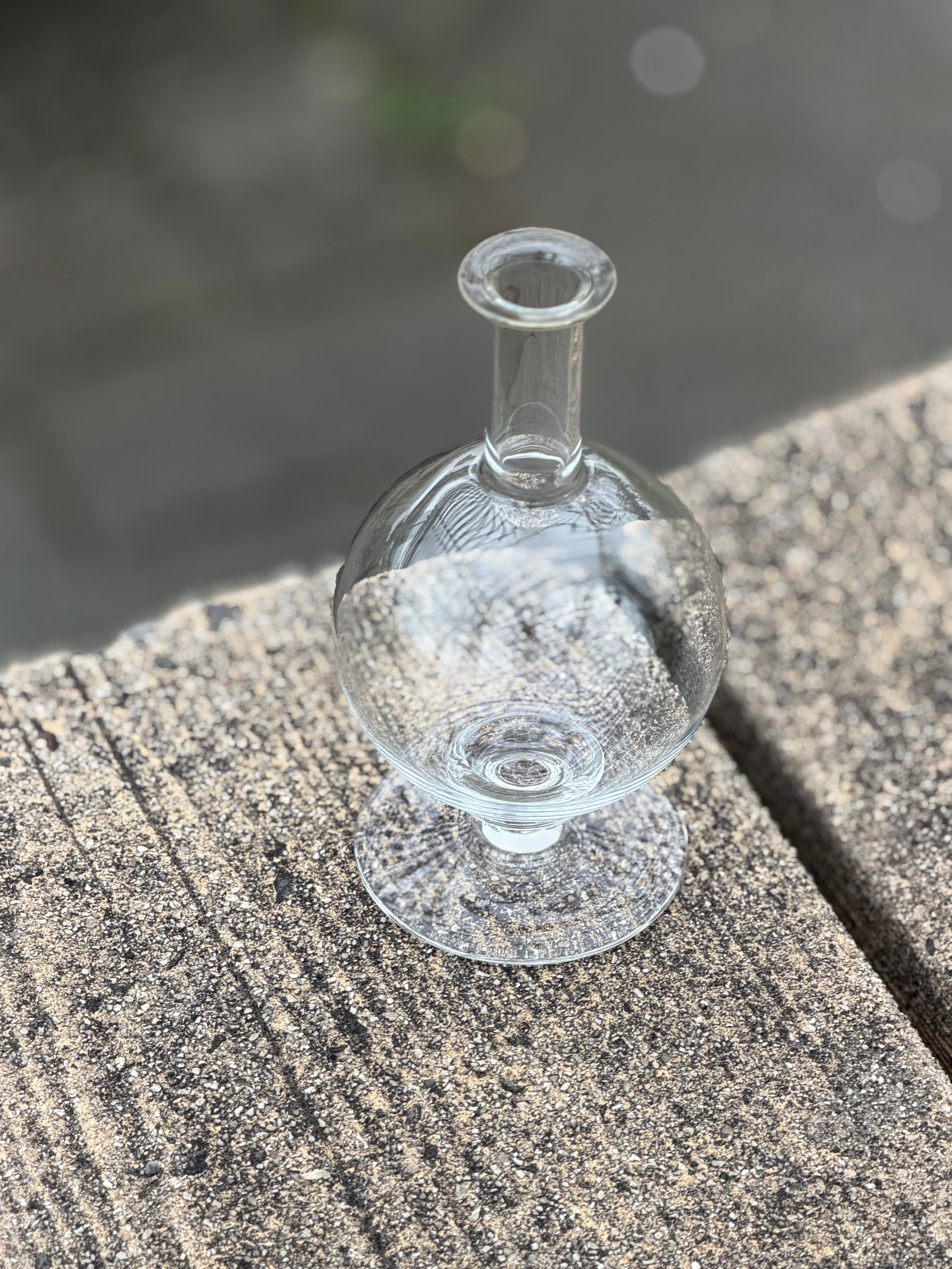 丸みを帯びた球体のボディは、どこか愛らしく、どこか神秘的。細く伸びたネックと安定感のある台座が、その丸さをいっそう引き立てる。作家がひと吹きごとに形づくったガラスには、揺らぎと温もりが封じ込められている。