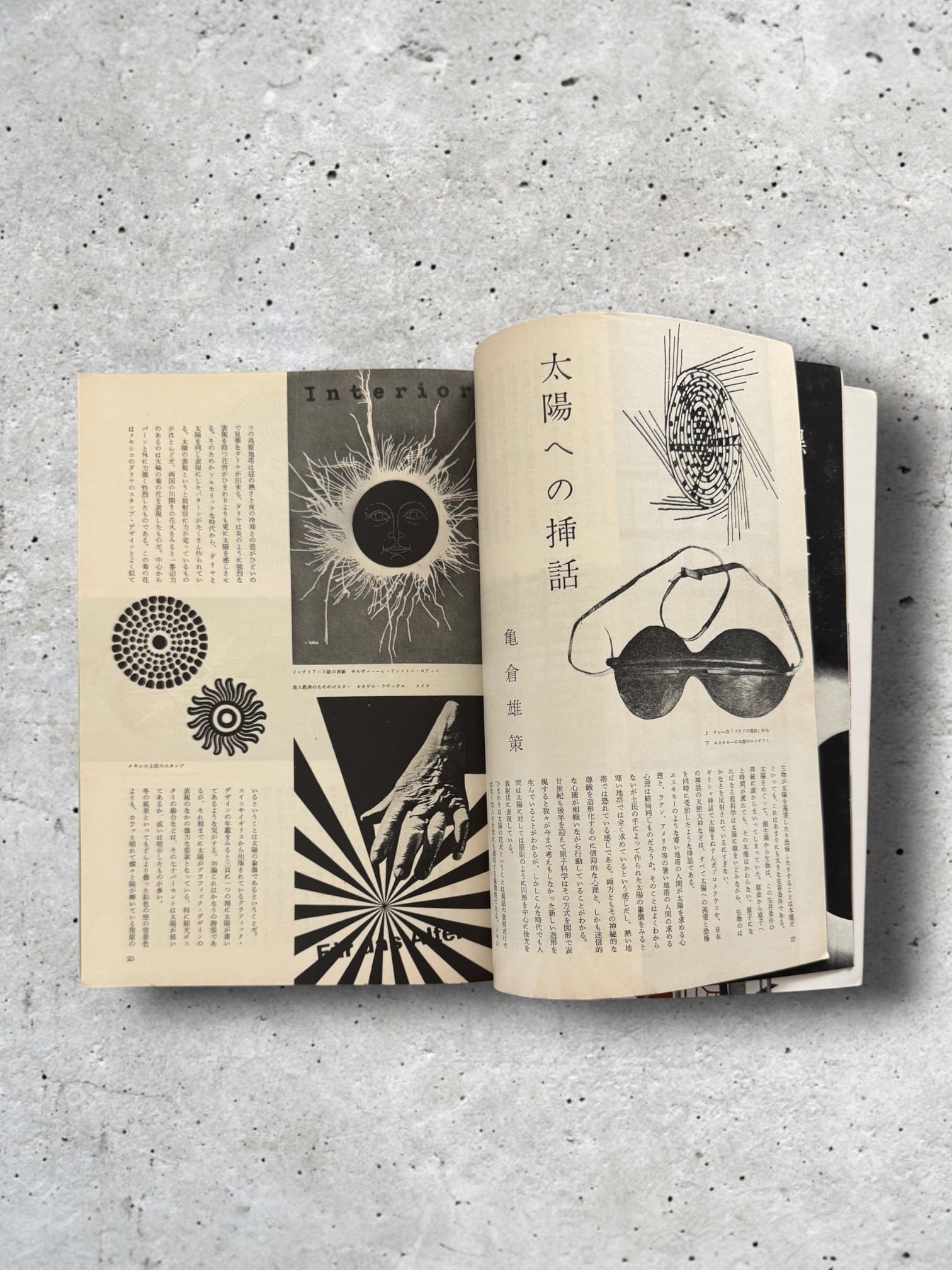 美術出版社刊のインテリア・デザイン専門誌『リビングデザイン』の第20号。特集は「太陽へのうた」—岡本太郎、亀倉雄策、清家清ら、時代を代表するクリエイターたちが「太陽」をテーマに競演する、異色かつ豪華な一冊です。